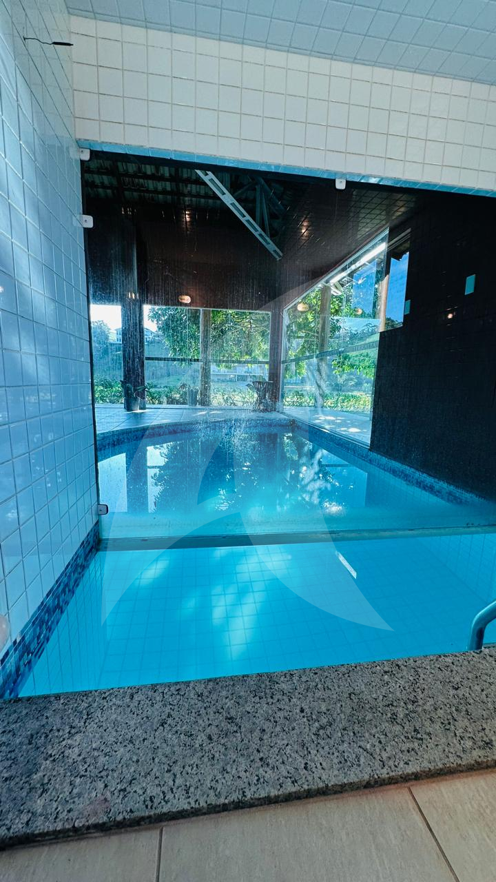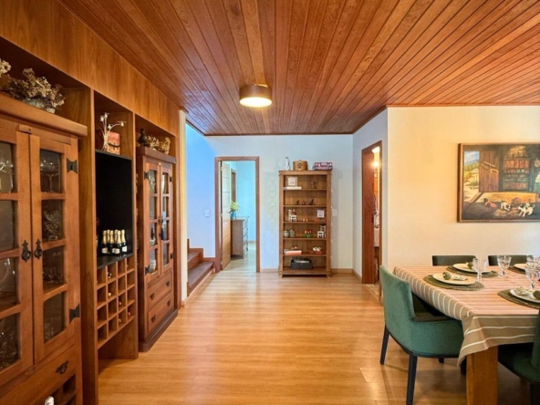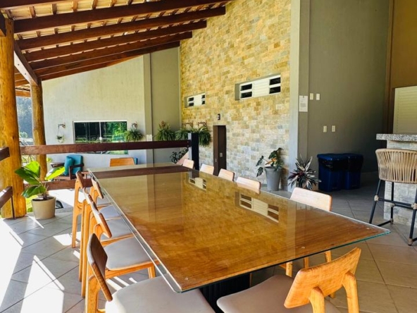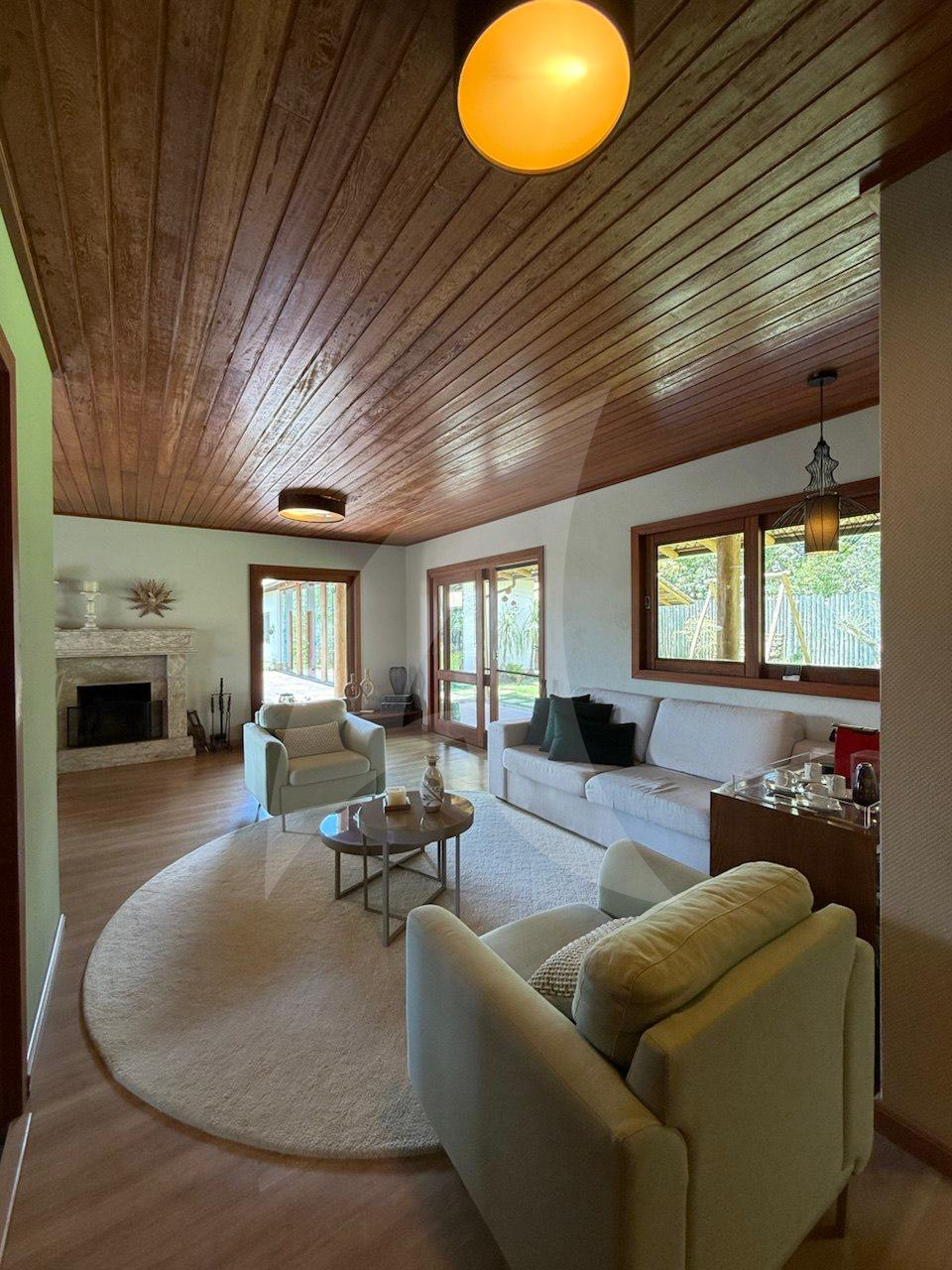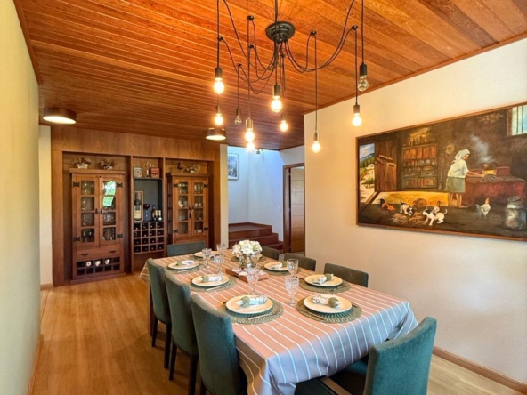 • Ambientes Integrados: Sala de estar com lareira, sala de jantar e TV com amplos vãos de vidro, garantindo iluminação natural e vista panorâmica.
