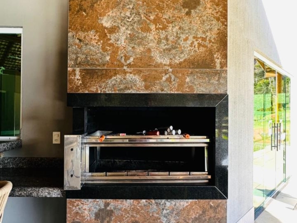 • Espaço gourmet fechado em vidro com churrasqueira, fogão e forno a lenha.