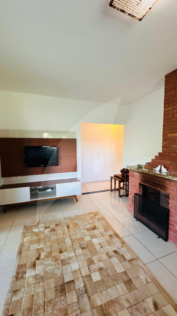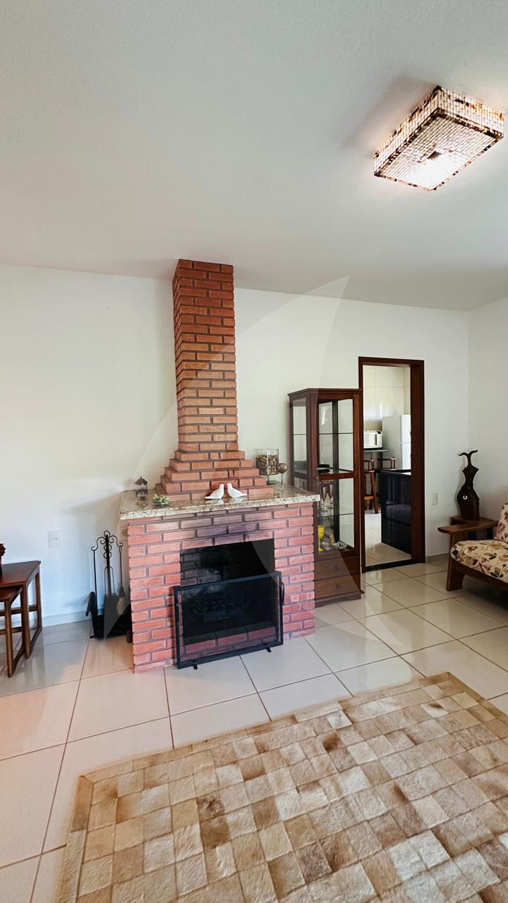 Sala com lareira integrada à varanda gourmet (churrasqueira, pia, bancada em granito, mesa de madeira 8 lugares, fechamento em vidro)